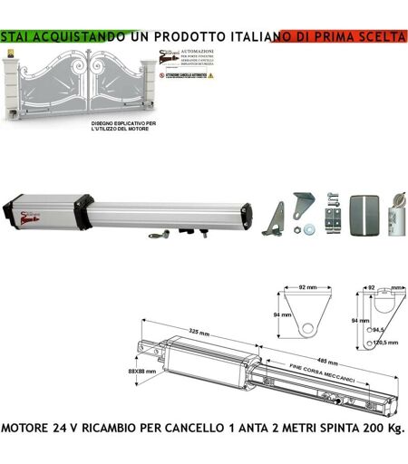 SECURVERA Pistone Cancello Automatico 2 Metri Motore 24 Vcc Corsa 300 mm con Sblocco a Chiave Ricambio Automazione Originale con Finecorsa Meccanici