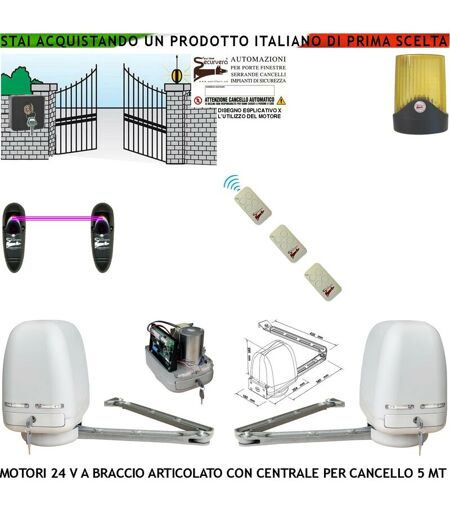SECURVERA Kit 2 Motori a Braccio Articolato 24 v Cancello Automatico 2 Ante da 0,5 a 2,5 mt Centrale 220/24 v 3 Radiocomandi Faro Selettore Coppia Fotocellule