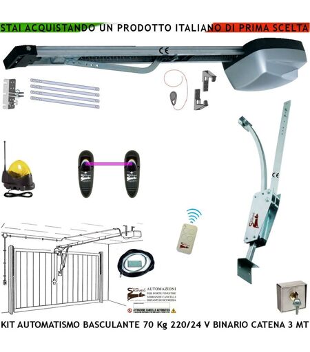 SECURVERA Basculante 70 Kg Kit Automatismo Motore 220/24 v da Soffitto Faro Antenna Selettore Binario Alluminio Catena Acciaio 3 Metri Cordino Sblocco Pattino