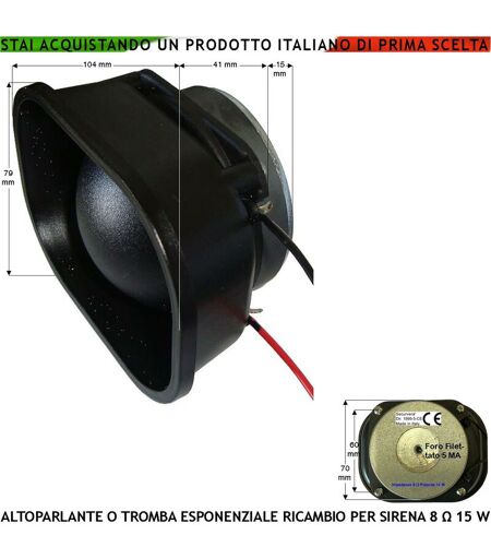 LISTA DETTAGLIATA COMPONENTE - CARATTERISTICHE REALI E FUNZIONI NELLA SCHEDA TECNICA •01 SH-G18 Tromba Magnetodinamica o Altoparlante Impedenza 8 &Omega,; Potenza 15 W. Frequenza 1,3 ±, 20 KHz. SPL 1m: 103 dB •01 SV-GAR Certificato di Garanzia 24 Mesi, a vita Contro i Difetti di Fabbrica: Installazione Personale Qualificato D.M.37/2008 •01 SV-IST Istruzioni Dettagliate per il Montaggio Devono Essere Rispettate: Fissaggi Collegamenti Particolari (Manuale PDF) CARATTERISTICHE GENERALI DEL PRODOTTO COMPLETO DI TUTTE LE PERIFERICHE SH-G18 Tromba magnetodinamica esponenziale o Altoparlante. Resistenza bobina o Impedenza 8 &Omega,; ±, 15 %. Potenza 15 W. Frequenza di risonanza 1,3 ±, 20 KHz. SPL @ 1W / 1m: 103 dB. Temperatura di funzionamento - 20° + 60° C. Magnete permanente Ø, 69 mm, spessore 15 mm. Forma circorettangolare arrotondata. Tromba o diffusore acustico in ABS. Forma Dimensione esterne L104XH79XP55 mm. Peso 458 gr. Provvisto di 2 fili di circa 200 mm. per la connessione. ...