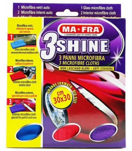 3Shine Mafra Panni auto; Panni capaci di eliminare tutte le impurità presenti nell'abitacolo, sui vetri o sulla carrozzeria; Hanno un potere assorbent molto elevato e grazie ai loro sottili filamente eliminano in profondità le molecole dello sporco. I tre panni sono rispettivamente: rosso per interni/ Viola per esterni/ Blu per vetri. 3Shine Mafra Panni auto Panni capaci di eliminare tutte le impurità presenti nell'abitacolo, sui vetri o sulla carrozzeria. hanno un potere assorbent molto elevato e grazie ai loro sottili filamente eliminano in profondità le molecole dello sporco. I tre panni sono rispettivamente: rosso per interni/ Viola per esterni/ Blu per vetri. ...
