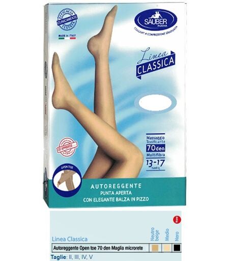 SAUBER Linea CLASSICA Open Toe - AUTOREGGENTE 70 den Maglia Microrete - Descrizione Può essere utilizzato durante la stagione estiva per continuare a godere dei benefici della compressione mantenendo la libertà delle dita. Realizzato in maglia microrete a doppia ricopertura. - Colori: - Medio - Ne… ...