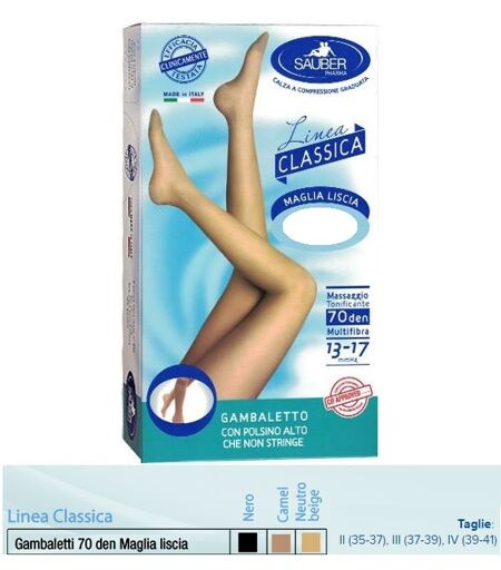SAUBER Linea CLASSICA MAGLIA LISCIA - GAMBALETTO 70 DEN - Descrizione Pratico e facile da indossare è particolarmente indicato per essere utilizzato con i pantaloni. Consente di "godere" dei benefici della compressione graduata senza dover necessariamente indossare un collant. Realizzato con polsi… ...
