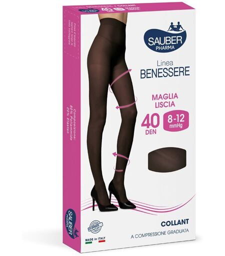 Sauber Linea Benessere Collant Velato 40 DEN Maglia Liscia Descrizione Dispositivo Medico CE Classe I (Dir. 93/42/Cee). Collant confortevole e facile da indossare, adatto alle donne di tutte le età; anche per le più giovani. Dalla trama velata e con filato che conferisce un’elevata durata del capo. Filato doppio ricoperto. Corpino a effetto contenitivo con bordo comfort. Senza tallone pendolare e con punta invisibile. Caratteristiche Svolge una delicata azione rilassante e riposante e attenua la sensazione di gambe stanche e indolenzite. Tipologia di massaggio: Riposante. 8-12 mmHg: compressione massima esercitata alla caviglia e decrescente verso il polpaccio e la coscia, espressa in millimetri di mercurio (mmHg). Formato Disponibile in 4 taglie (2, 3, 4, 5), color camel. ...