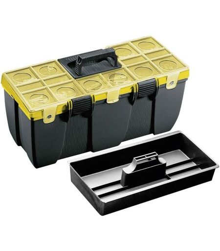 Pratica cassetta degli attrezzi che trova diversi impieghi nell'ambito dell'officina. Infatti queste cassette alla loro grande capienza aggiungono un coperchio attrezzato con scomparti di varie dimensioni per una funzionale organizzazione delle minuterie. Gli obló del coperchio permettono di individuare facilmente la posizione dei vari accessori. Con portattrezzi e coperchio attrezzato a portaminuterie. Predisposta per chiusura con lucchetto. ...