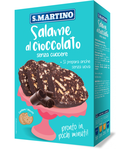 Ideale per chi ha poco tempo e non vuole rinunciare ad un dolce delizioso. Prepararare il Salame al Cioccolato con il preparato S.Martino è semplicissimo, basta aggiungere solo burro e acqua. Per una versione più golosa puoi aggiungere un uovo. Facile e veloce da preparare prechè senza cottura, contiene già al suo interno i biscotti secchi e la carta forno. Suggerimento: sorprendi in tavola con un effetto gourmet...aggiungi al tuo dolce una manciata di nocciole o pistacchi tritati e decoralo con zucchero a velo e fragoline di bosco. ...