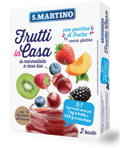 Con FruttinCasa S.Martino fare la marmellata non è mai stato così facile! Basta aggiungere al preparato la tua frutta preferita...segui i consigli e le idee del ricettario contenuto nella confezione, per una confettura genuina e non troppo dolce, che sa conservare tutto il gusto le proprietà della frutta. Qualche informazione in più: con pectina di frutta e senza glutine. Nella confezione trovi 2 buste, ogni busta è la dose per 1 Kg di frutta e 350 grammi di zucchero. Consigli: scegli la frutta sana e ben matura, utilizza vasi con coperchio a gancio o a capsula, puliti, asciutti e preriscaldati e riempili fino all'orlo. Scarica il nostro Ricettario ...