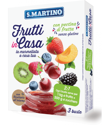 Scegli FruttinCasa S.Martino per fare la marmellata in pochissimi minuti! Puoi crearla di tantissimi gusti diversi, con la frutta che più preferisci. Rendi dolce il tuo risveglio spalmandola su una fetta di pane o fette biscottate, prepara profumate crostate o biscottini ripieni di marmellata...puoi farcire anche le tue torte per renderle ancora più gustose. Il ricettario contenuto nella confezione ti offre tanti spunti e idee...ce n'è per tutti i gusti! Qualche informazione in più: con pectina di frutta e senza glutine, FruttinCasa è un aiuto sicuro e naturale per fare in casa la marmellata. Nella confezione trovi 3 buste, ogni busta è la dose per 1 Kg di frutta e 500 grammi di zucchero. Consigli: scegli la frutta sana e ben matura, utilizza vasi con coperchio a gancio o a capsula, puliti, asciutti e preriscaldati e riempili fino all'orlo. Scarica il nostro Ricettario ...