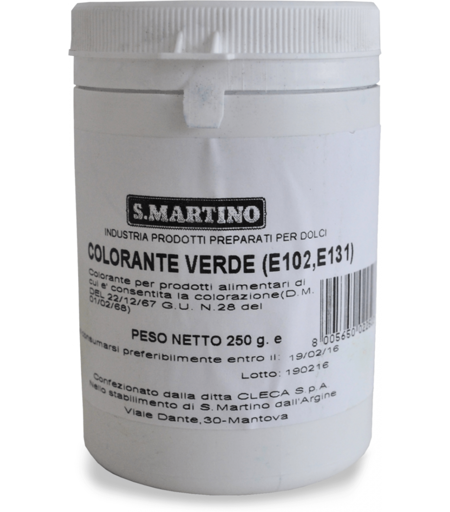 Più colore ed allegria ai tuoi dolci con il Colorante Verde S.Martino! Appositamente formulato per uso alimentare, con la sua comoda consistenza in polvere, consente di colorare, dopo averlo diluito in acqua, impasti e paste modellabili e creare decorazioni. Decidi tu l'intensità che vuoi ottenere, dal verde più chiaro e luminoso a quello più intenso e vivace, basterà solo aumentare o diminuire il quantitativo di acqua in cui sciogliere il prodotto. I nostri consigli: provalo per preparare marzapane e frutta martorana. Per una colorazione intensa, consigliamo comunque di non eccedere la dose di 10 grammi per ogni litro di acqua. Qualche informazione in più: colorante E102, E131, E514 solubile in acqua. Colorante per uso alimentare con le limitazioni previste dal Reg.CE 1129/2011. ...