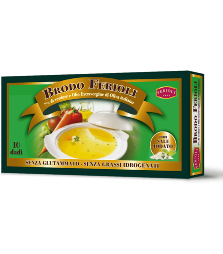 Tutto il gusto delle verdure racchiuso nel Brodo Ferioli! Il dado vegetale contiene ben 5 tipi di verdure e olio extravergine di oliva italiano, per esaltare al meglio il sapore dei tuoi piatti...contorni, zuppe, sughi, risotti e tante altre ricette! Basta sciogliere un dado in mezzo litro di acqua per ottenere un buon brodo vegetale in pochissimo tempo. Qualche informazione in più: il Brodo Vegetale Ferioli è senza glutammato, senza grassi idrogenati e con sale iodato. La confezione contiene 10 dadi. Curiosità: provalo per insaporire il minestrone, saprai così esaltare ancora di più il profumo delle verdure. ...