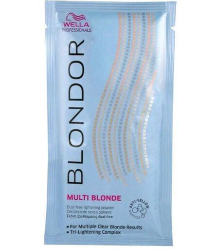 8005610586991 - Wella - Ottieni La Perfetta Tonalità Bionda Che Hai Sempre Sognato. La Polvere Schiarente Wella Professionals Blondor Multi Blonde Ti Consente Di Schiarire In Modo Affidabile Il Colore Dei Tuoi Capelli Di Ben 7 Tonalità. La Polvere Si Può Usare Su Capelli Naturali E Tinti Ed È Un Complemento Ideale Per Tutte Le Tecniche Schiarenti. Grazie Alla Speciale Tecnologia Tri-Lightening, Previene Anche Gli Spiacevoli Pigmenti Gialli O Arancioni. Caratteristiche: Schiarisce Il Colore Dei Capelli Di Ben 7 Tonalità Conferisce Ai Capelli Un Colore Luminoso E Radioso Libera I Capelli Dagli Spiacevoli Pigmenti Gialli O Arancioni È Adatta A Tutte Le Tecniche Schiarenti Può Essere Usata Su Capelli Naturali O Tinti Composizione: Complesso Tri-Lightening – Riduce Le Sfumature Gialle E Arancioni Durante Lo Schiarimento Modo D’uso: Miscelare La Polvere Schiarente Con L’attivatore Koleston Perfect Crème (6%, 9% O 12%) O Con L’emulsione Attivante Colour Touch (1,9% O 4%) Con Un Rapporto Da 1:1,5 A 1:2. In Caso Di Contatto Con Il Cuoio Capelluto, Utilizzare Al Massimo L’attivatore 6%. ...