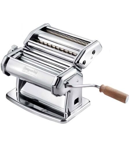 MACCHINA PER LA PASTAIMPERIA COD. 100 CARATTERISTICHEE' la macchina tradizionale manuale per uso casalingo in acciaio cromato impasta e tira una sfoglia da 150 mm in 6 diversi spessori.E' dotata di un accessorio da taglio Duplex per Maccheroni alla chitarra 2 mm. e Fettuccine 6 5 mm di morsetto e manovella in acciaio cromato con impugnatura in faggio naturale evaporato.Sostituendo l'accessorio Duplex si possono montare tutti gli accessori opzionali della serie Imperia. EAN 8005782001001 ...