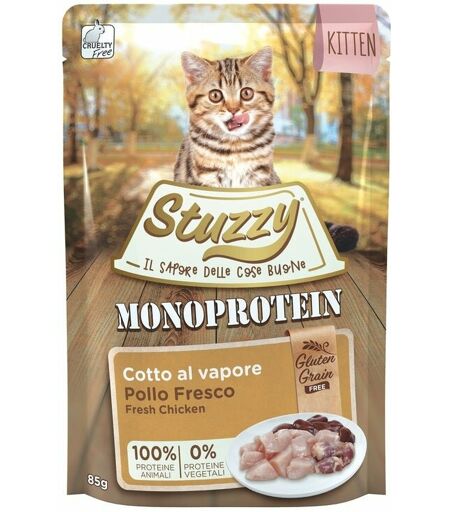 Stuzzy KITTEN MONOPROTEIN Pollo Fresco Descrizione Alimento completo con una singola fonte proteica animale, che offre al gatto il gusto irresistibile degli ingredienti di qualit�, preservato dall'attenta cottura al vapore. Grain & Gluten free. Ingredienti Pollo fresco* 70%, ...