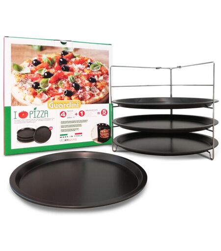 GUARDINI Set 4 tegami pizza ø 28 cm + 1 griglia porta tegami, Acciaio con rivestimento antiaderente, Nero, Made in Italy, Linea Pizza&Mania -