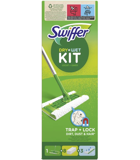 Lo Swiffer Kit contiene 1 manico, 8 panni cattura polvere e 3 salviette detergenti. All'interno troverai tutto per la pulizia a secco e ad umido della tua casa. ...