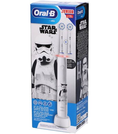 Oral-B PRO 3 Junior Star Wars Spazzolino Elettrico Lo spazzolino elettrico Oral-B Junior Star Wars per età da 6 anni è progettato in collaborazione con i dentisti per ottenere una pulizia superiore. Per proteggere le gengive delicate dei bambini, è dotato di un controllo della pressione di spazzolamento gengivale che fa lampeggiare una luce rossa e riduce la velocità di spazzolamento quando rileva che lo spazzolamento è troppo forte. Inoltre, la testina rotonda presenta setole extra morbide. Per rendere lo spazzolamento ancora più divertente, può essere utilizzato con l’app gratuita Disney Magic Timer di Oral-B. Infatti, il 90% dei bambini spazzolano più a lungo con l’app. È lo spazzolino giusto per aiutare i bambini a spazzolare in modo indipendente e a sviluppare sane abitudini di spazzolamento che dureranno nel tempo. Modo d'uso: Vibra ogni 30 secondi per avvertire il bambino di cambiare l’area che sta spazzolando. 2 modalità di spazzolamento: Pulizia Quotidiana e Denti Sensibili. Può essere utilizzato con l’app gratuita Disney Magic Timer di Oral-B per rendere lo spazzolamento più divertente. Adatto dai 6 anni in su. La batteria ricaricabile dura fino a 2 settimane con una ricarica completa. Formato: 1 manico, 1 testina Sensi Ultrathin, 1 caricatore. ...