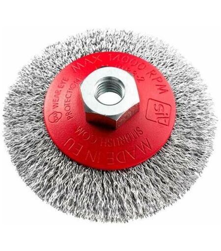 Spazzola conica con foro filettato MA14 F Fili acciaio ondulati mm 0,35 Ø mm 90/120 Altezza fili mm 20/22 Adatta per lavori su superfici irregolari Confezione scatolata ...