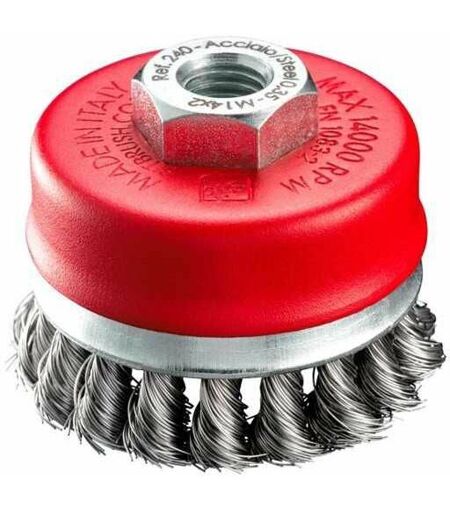 Spazzola a tazza con foro filettato MA14 F Fili acciaio ritorti mm 0,35/0,50 mazzetti 18/24 Ø mm 70/95 Altezza fili mm 17/90 Adatta per eliminazione scorie, ruggine, vernici Confezione scatolata ...