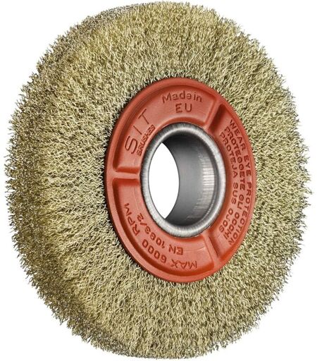 Filamenti in acciaio ottonato ondulato. Fornite con kit riduzione multiforo. Per utilizzo su mole da banco, per lavori di sbavatura, satinatura e lucidatura di superfici di ogni materiale e forma. ...