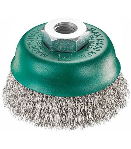 Spazzola a tazza con foro filettato MA14 F Fili acciaio inox ondulati mm 0,30 Diametro mm 80 Altezza fili mm 25 Adatta per preparazione verniciatura metallo ...