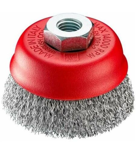 Spazzola a tazza con foro filettato MA14 F Fili acciaio ondulati ottonati mm 0,30 Ø mm 60/80 Altezza fili mm 25/30 Adatta per pulizia metallo,legno, pietre ...