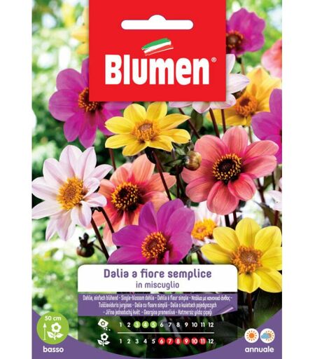 Dalia a fiore semplice in miscuglioPianta annuale a fioritura prolungata dai fiori semplici di colori vivaci. Indicata per aiuole e bordure basse.Trapianto: si consiglia di trapiantare le piantine quando raggiungono l’altezza di circa 10 cm. Caratteristiche tecniche Accessori in Dotazione ...