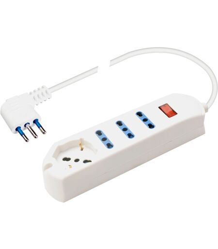 Presa multipla 250 V~ con 3 prese "grandi" 10 / 16 A 2P+T, standard italiano, 1 presa "grande" pluristandard 10 / 16 A 2P+T, standard italiano 10 / 16 A e tedesco 16 A (con terra laterale), 1,5 m cavo 3x0,75mm² con spina "piccola" salvaspazio 10 A 2P+T, interruttore di sicurezza. Spegnendo l`interruttore è possibile risparmiare energia elettrica ed eliminare lo stand-by dei dispositivi elettronici. Le prese pluristandard consentono il collegamento di tutte le spine standard italiano e tedesco, essendo inoltre inclinate di 45° facilitano l`inserimento di più spine ingombranti (es. alimentatori). Colore bianco. ...