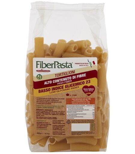 FiberPasta Tortiglioni - Descrizione Pasta a basso indice glicemico. Ha un contenuto di fibre molto elevato. Grazie all’elevato contenuto di fibre che permette un minor assorbimento di grassi e zuccheri (permettendo una minore assunzione di calorie), FiberPasta è consigliata per il controllo del pe… ...
