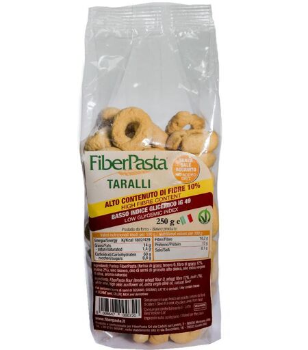 FIBERPASTA Taralli a basso indice glicemico - Descrizione I Taralli FiberPasta hanno un basso indice glicemico IG 49, un alto contenuto di fibre (10%), e non hanno sale aggiunto. Prodotto adatto ai vegani. - Ingredienti Farina FiberPasta (farina di grano tenero 0, fibra di grano 12%, inulina 2%), v… ...