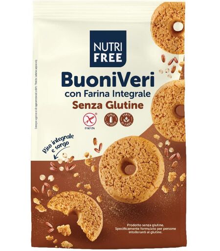 NUTRI FREE - Buoni Veri - Descrizione Biscotti con farina integrale. - Ingredienti Amido di mais, zucchero di canna 22%, uova 13%, olio di palma, farina di riso integrale 7,2%, farina di sorgo 7,2%, crusca di riso 5,5%, burro senza lattosio*, latte scremato in polvere senza lattosio*, fibra di acac… ...