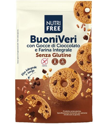 NUTRI FREE - Buoni Veri - Descrizione Biscotti con gocce di cioccolato e farina integrale. - Ingredienti Amido di mais, zucchero di canna 21%, uova 11%, gocce di cioccolato 9,4% (zucchero, pasta di cacao, burro di cacao; emulsionante: lecitina di girasole; aroma naturale), olio di palma, farina di … ...