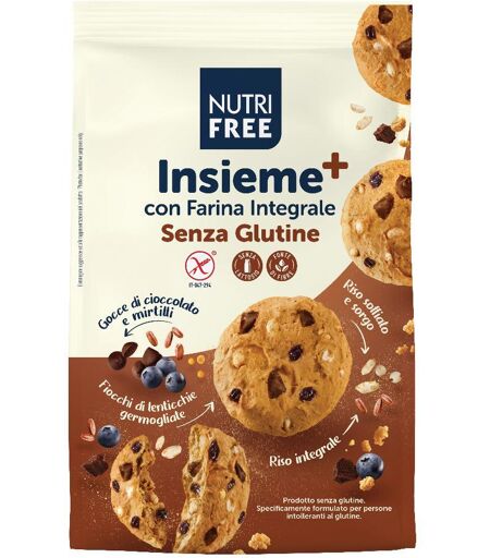 NUTRI FREE - Insieme+ - Descrizione Biscotti con riso e integrale, con gocce di cioccolato e mirtilli. - Ingredienti Amido di mais, zucchero, gocce di cioccolato 9% (zucchero, pasta di cacao, burro di cacao; emulsionante: lecitina di girasole; aroma naturale), olio di palma, uova 6%, albume d’uovo,… ...