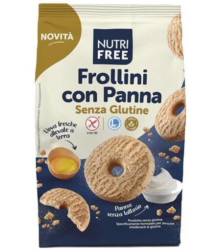 NUTRI FREE - Frollini con Panna - Ingredienti Amido di mais, farina di riso, zucchero, olio di semi di girasole, uova fresche da allevamento a terra 4,4%; fibre vegetali: cece, mais; fibra di acacia, panna* senza lattosio 2%, burro* senza lattosio 2%, aroma naturale, sale; agente lievitante: carbon… ...