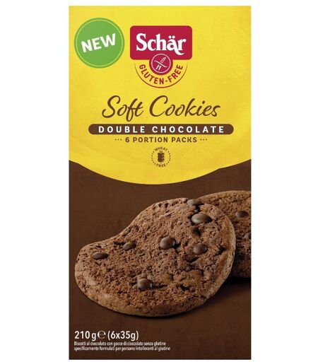 Soft Cookies - DOUBLE CHOCOLATE - Descrizione Biscotti con doppio cioccolato senza glutine e privo di olio di palma. Adatto ai vegetariani. Ingredienti Amido di mais, gocce di cioccolato 14% ( zucchero, pasta di cacao *, burro di cacao *; emulsionante: lecitina di soia; aromi naturali ), zucchero b… ...