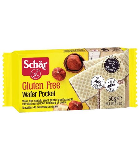 Schär Wafer Pocket - Wafers alle nocciole senza glutine. Ingredienti Fecola di patate; zucchero; grasso vegetale non idrogenato; farina di riso; pasta di nocciole (7,7%); maltodestrine; siero di latte in polvere; farina di soia; cacao magro in polvere; emulsionante: lecitina di soia; addensante: fa… ...
