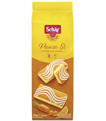 Schär - Pausa Sì - Descrizione Merendine di pan di spagna senza glutine al gusto di carota e arancia. Specificamente formulate per persone intolleranti al glutine. Ingredienti Zucchero, uova, sciroppo di glucosio - fruttosio, oli e grassi vegetali in proporzione variabile (olio di girasole alto ole… ...