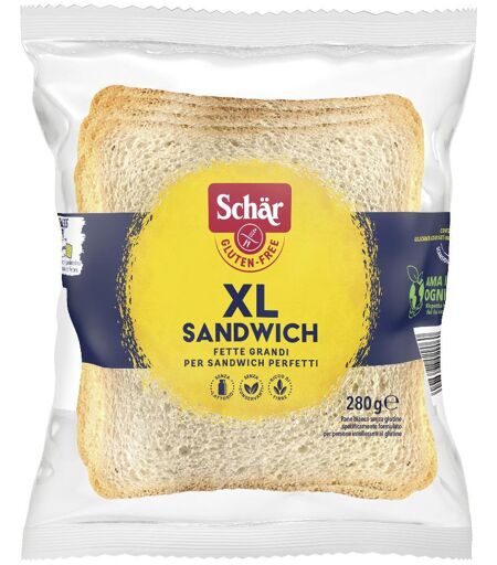 Schär - XL SANDWICH - Descrizione Pane bianco a fette. Vegetarian ok. Ricco di fibre. - Ingredienti Amido di mais, acqua, fecola di patate, pasta madre (farina di riso, acqua) 8%, proteine di soia; addensanti: idrossipropilmetilcellulosa, gomma di guar; sciroppo di riso, amido di riso, olio di gira… ...