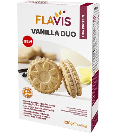 VANILLA DUO - Descrizione Biscotti aproteici ripieni di crema alla vaniglia. Con edulcorante. Ingredienti Amido di mais, crema alla vaniglia 29% [edulcorante: maltitolo; grasso di cocco, amido di patate, fibra vegetale (inulina di cicoria); emulsionante: lecitina di girasole; aroma naturale di vani… ...