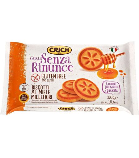 Gusto Senza Rinunce BISCOTTI AL MIELE MILLEFIORI - Il prodotto è specificatamente formulato per persone intolleranti al glutine. Senza glutine. Contenuto di glutine < 20 ppm. Ingredienti Fecola di patate, amido, farina di mais, zucchero, olio di semi di girasole 15,6%, farina di riso, miele millefi… ...