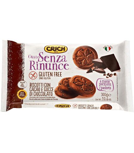 Gusto Senza Rinunce BISCOTTI CON CACAO E GOCCE DI CIOCCOLATO - Il prodotto è specificatamente formulato per persone intolleranti al glutine. Senza glutine. Contenuto di glutine < 20 ppm. Ingredienti Fecola di patate, farina di mais, amido, zucchero, gocce di cioccolato fondente 10,3% (Cacao 46% min… ...