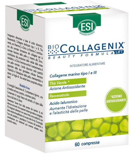 ESI - BIOCOLLAGENIX BEAUTY FORMULA LIFT - Descrizione Integratore alimentare a base di acido ialuronico, resveratrolo, collagene idrolizzato tipo I e III, tè verde, con vitamina C e zinco. La vitamina C contribuisce alla normale formazione del collagene per la normale funzione della pelle e, insiem… ...
