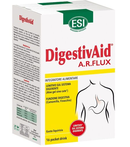 ESI DigestivAid A.R.FLUX Descrizione Integratore alimentare a base di estratti di camomilla, finocchio, liquirizia, con aloe vera gel. Camomilla e finocchio favoriscono la funzione digestiva. Camomilla ed aloe gel hanno azione emolliente e lenitiva sul sistema digerente. La liquirizia favorisce la funzionalità del sistama immunitario. Ingredienti Acqua depurata; stabilizzante: glicerolo; addensanti: acido alginico e gomma di xantano; camomilla (Matricaria chamomilla L.) capolini e.s. tit. 0,3% apigenina, finocchio (Foeniculum vulgare Mill.) frutto e.s. tit. 0,5% olio essenziale, liquirizia (Glycyrrhiza glabra L.) radice estratto fluido, cloruro di sodio; correttore di acidità: idrossido di calcio; aroma; conservanti: sorbato di potassio e benzoato di sodio; aloe (Aloe barbadensis Mill.) gel senza cuticola conc. 200:1; edulcorante: sucralosio. Senza glutine. Caratteristiche nutrizionali Valori medi per 1 pocket drink (20 ml) per 2 pocket drink (40 ml) dose massima giornaliera Camomilla e.s. 200 mg 400 mg Finocchio e.s. 200 mg 400 mg Liquirizia e.f. 200 mg 400 mg Aloe conc. 200:1 30 mg 60 mg Modalità d'uso Si consiglia l'assunzione di 1 pocket drink (20 ml) tal quale, dopo i pasti principali o all'occorrenza. Avvertenze Tenere fuori dalla portata dei bambini di età inferiore ai tre anni. Non superare la dose giornaliera consigliata. Gli integratori alimentari non vanno intesi come sostituti di una dieta variata ed equilibrata e di un sano stile di vita. Un consumo eccessivo può avere effetti lassativi. Non assumere in gravidanza. Eventuali variazioni di colore e la presenza di un eventuale sedimento indica la naturalità del prodotto e non ne pregiudica la qualità. Conservazione Conservare in luogo fresco e asciutto, lontano da luce e fonti di calore. Formato Confezione da 16 pezzi. Cod. 1002 ...