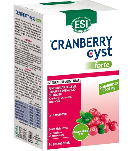 ESI CRANBERRY cyst forte - Descrizione Integratore alimentare a base di estratto titolato di cranberry, uva ursina, verga d'oroe tè verde, con D - mannosio. Gli estratti di cranberry, verga d'oro ed uva ursinafavoriscono la funzionalità delle vie urinarie ed il drenaggio dei liquidicorporei. L'estr… ...