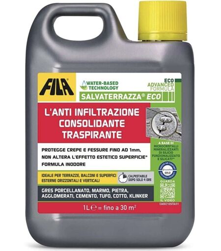 Protegge e ripara le terrazze e superfici esterne sia orizzontali che verticali in cotto, klinker, gres e cemento, pietre naturali e ricostruite, agglomerati dall’acqua e dall’umidità Penetra nel materiale consolidandolo Elimina il problema delle infiltrazioni Previene la percolazione dell’acqua, la formazione di muffe alghe, muschi ed efflorescenze nonché gravosi danni alle strutture Protegge e consolida le fughe Penetra in fessurazioni che vanno da 0,5 µm a 1 mm, conferendo loro caratteristiche idrorepellenti Salvaterrazza ECO 1 LT Su superficie asciutta e pulita (per una pulizia accurata utilizzare il detergente FASE ZERO), applicare SALVATERRAZZA® ECO in modo uniforme su tutta la superficie con un vello o altro opportuno applicatore, impregnando bene le fughe e le fessurazioni. Prima che il prodotto asciughi, rimuovere il residuo tamponando con un panno assorbente pulito, avendo cura di non ...