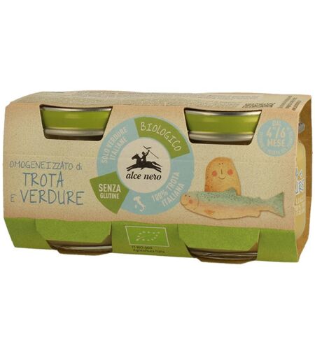 alce nero - OMOGENEIZZATO DI TROTA e VERDURE BIOLOGICO solo tacchino italiano DAL 4°/6° MESE Alimento biologico per l'infanzia. Contiene il 100% di materie prime italiane. 100% biologico. A basso contenuto di sodio, senza olio, senza aromi, coloranti o conservanti aggiunti. Senza glutine. Ingredien… ...