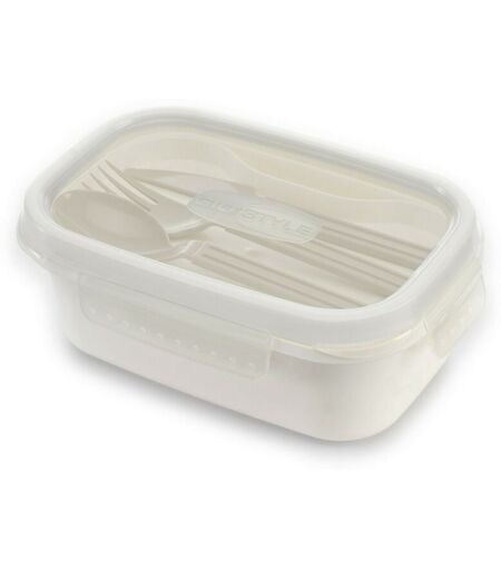 Lunch box capiente con set completo di posate. Coperchio ermetico che garantisce la conservazione degli alimenti. Dotato di vaschetta interna separatrice. Capacità 1,5 lt. Dimensioni cm 21x15x9 h ...