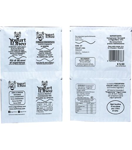 Yogurt Linea - Descrizione Fermenti liofilizzati di alta qualità per fare in casa tanto yogurt fresco, ricco di fermenti lattici "vivi". Formula concentrata. Senza conservanti, addensanti e OGM. Ingredienti Streptococcus thermophilus, Lactobacillus delbrueckii spp. bulgaricus. Senza glutine. Caratt… ...