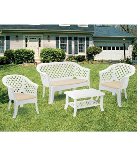 Salotto in resina - Composto da 1 divano monoblocco impilabile Lariana 134x72x76H cm., 2 poltroncine impilabili Lario 72x72x76H cm., 1 tavolino 90x60x46H cm. - Comprensivo di cuscini - Made in Italy ...
