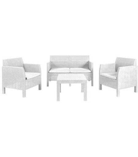 Set rattan Matilde bianco divano tavolo e poltrone Colore bianco. Struttura in resina effetto rattan resistente agli agenti atmosferici. Composto da: 2 poltrone 63x65xH76 cm., divano 2 posti 122x65xH76 cm. con cuscini. Tavolo 58x58xH41 cm. ...