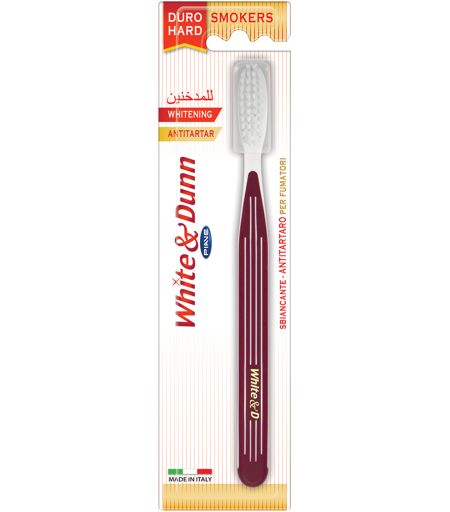 WHITE & DUNN Spazzolino per fumatori Spazzolino per fumatori con speciali setole sbiancanti che contengono carbonato di calcio (CaCO3) per una efficace rimozione delle macchie. Le setole dure permettono una rimozione ottimale della placca batterica e del tartaro. Manico ergonomico ma lineare studiato per un facile e corretto uso dello spazzolino. Cod. 3713 ...